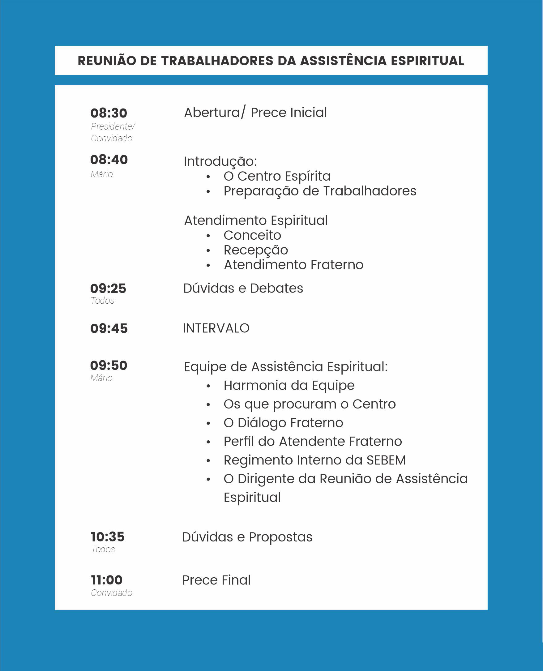 No dia 22 de junho (sábado), a diretoria da nossa casa vai realizar a 2ª REUNIÃO PARA TRABALHADORES DA ASSISTÊNCIA ESPIRITUAL, tendo como objetivo geral: “Disponibilizar aos colaboradores que atuam na SEBEM, momentos de aprendizado e reflexões sobre o papel do trabalhador espírita e sua responsabilidade na seara de Jesus e a necessidade de sua preparação a fim de atender aos objetivos propostos.”